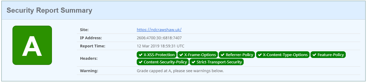 As part of this update, that is still in progress, I moved from using the stand-alone version of Ghost, to using the Docker image. This has not only allowed me to re-use the SQL cluster that is running already on this new platform, but also allow me to easily put Ghost behind a NGINX proxy, allowing better handling of the response headers. Thanks to this, I have upgraded from a D on securityheaders.com to an A. Though in order to get an A+, I will need to finish up my new website template as the current version has JavaScript that is not protected by an SRI hash. I also most defiantly need to update my Content Security Policy, but that will be part of the same update.